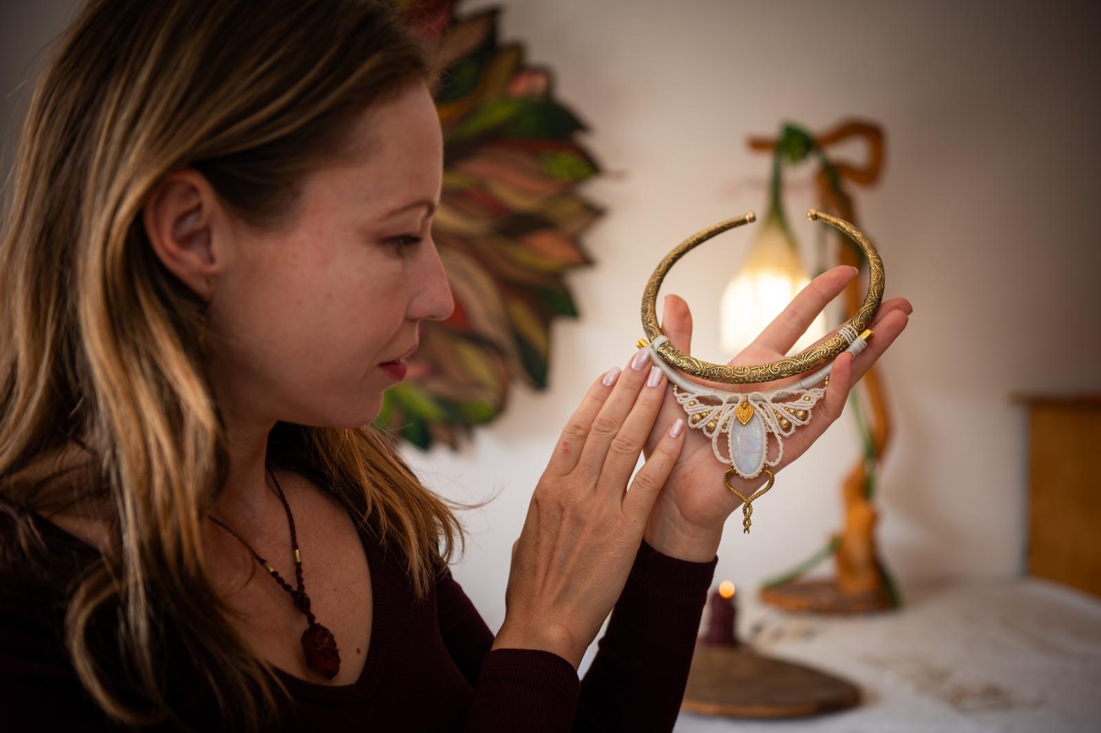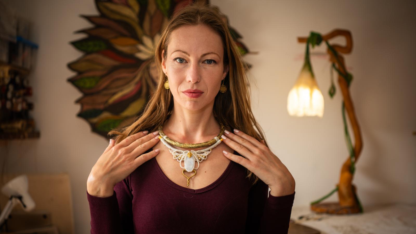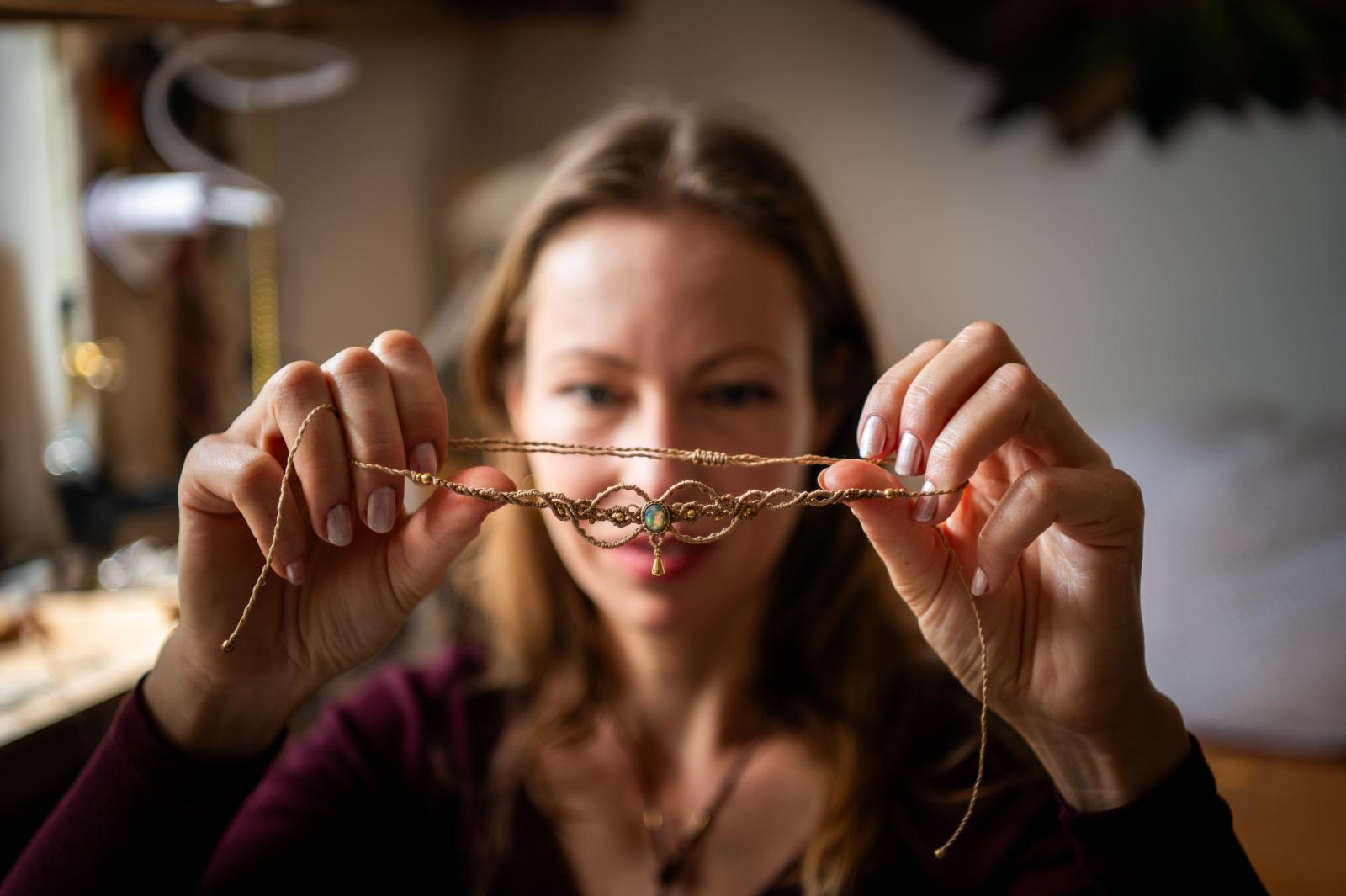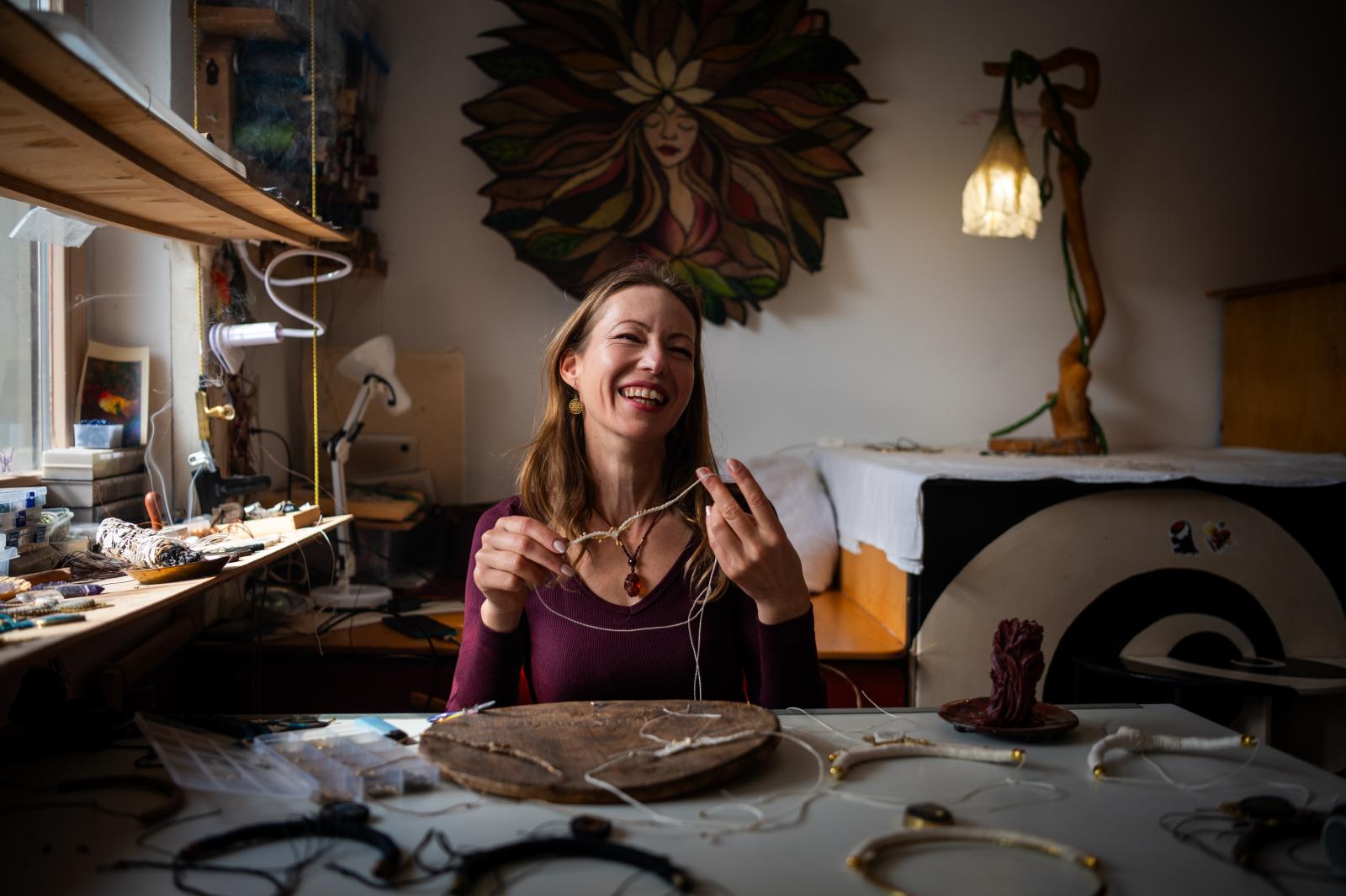 Mihály Cecília fonalakból és kristályokból alkot különleges nyakékeket és fejdíszeket, melyek összekapcsolják viselőjüket a természettel és saját belső ragyogásukkal. Lételeme az alkotás, akár makramézik, vagy önellátó kertjét gondozza a Nyimi Öko Közösségben. Nagy erő és alázat kell, hogy valaki megvesse a lábát idegenben, ő pedig kétszer is megtette: Székelyudvarhelyről előbb Budapestre, majd a somogyi kis faluba költözött, itt talált otthonra három gyermekével és több másik családdal együtt.