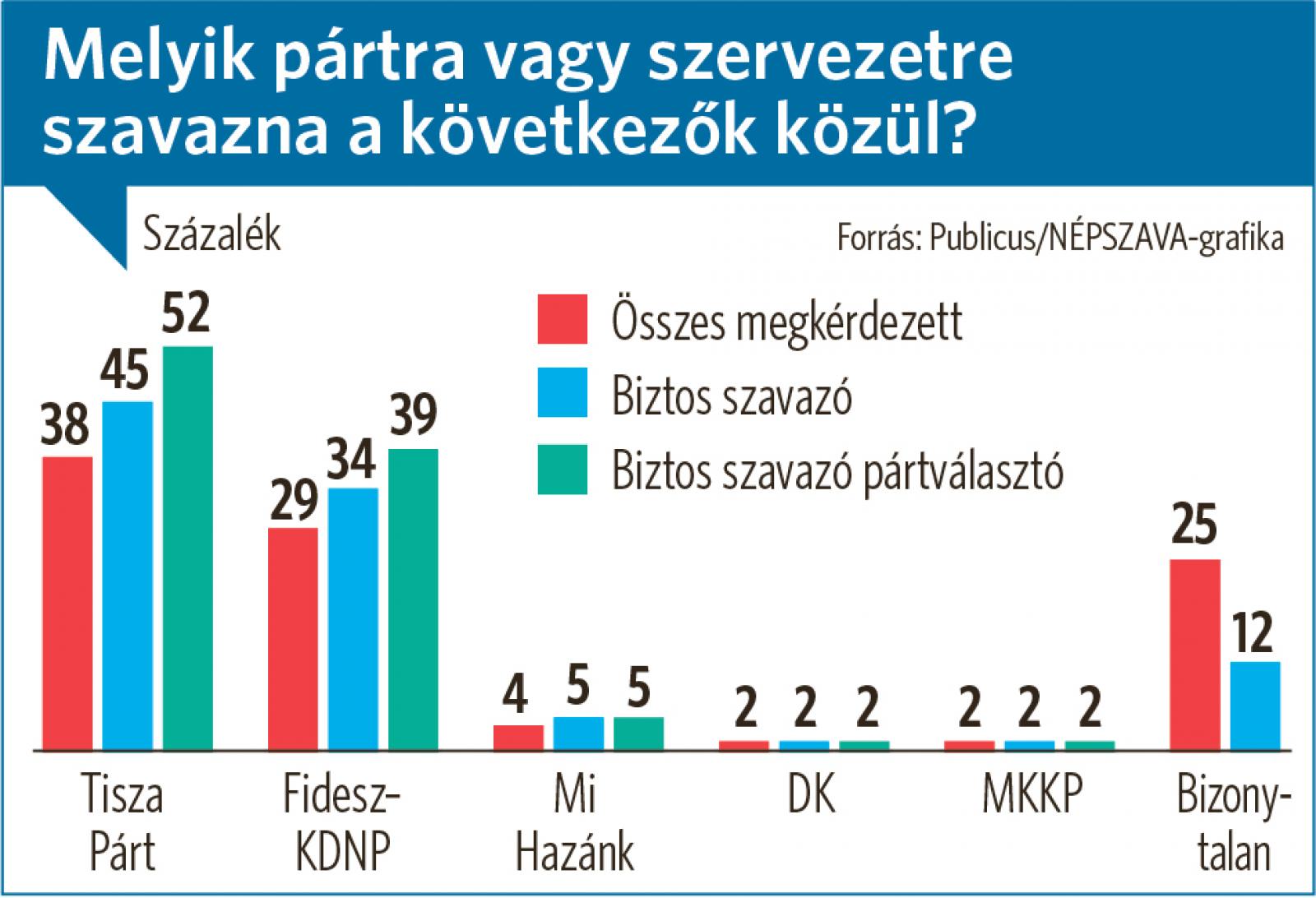A Népszava megbízásából a Publicus Intézet az elmúlt napokban elkészítette a választás előtti utolsó kutatását, amely egyértelműen az ellenzék és a kormányváltó hangulat erősödését mutatja. A Tisza a teljes népességben 38, a Fidesz 29 százalékon, a biztos szavazóknál 45, illetve 34 százalékon áll.