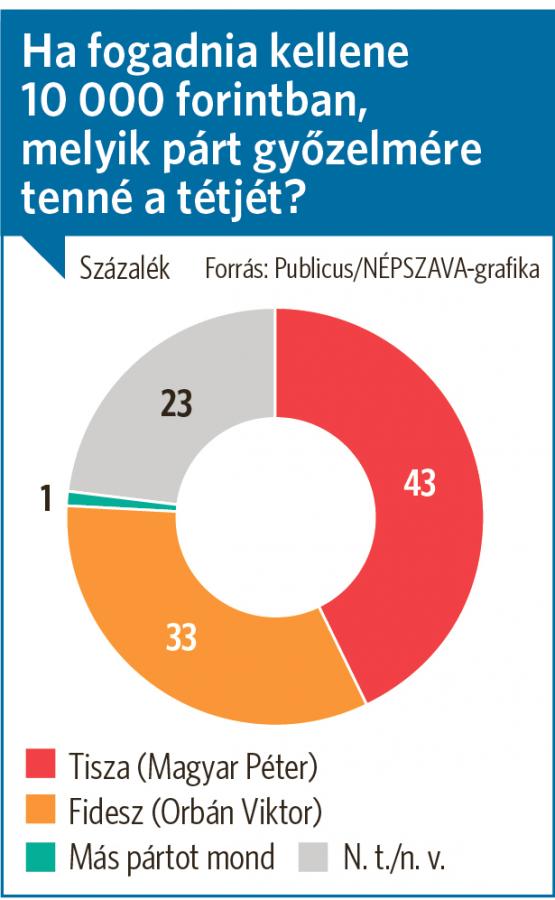 Ha fogadni kellene, hogy melyik párt nyeri a választást, a megkérdezettek 43 százaléka tenne a Tiszára, és csak 33 százalék a Fideszre (a többiek nem tudtak, vagy nem akartak válaszolni). Ennek alapján is jelentősen nőttek az ellenzék esélyei, a korábbi 4-hez képest most 10 százalékpontos a különbség.