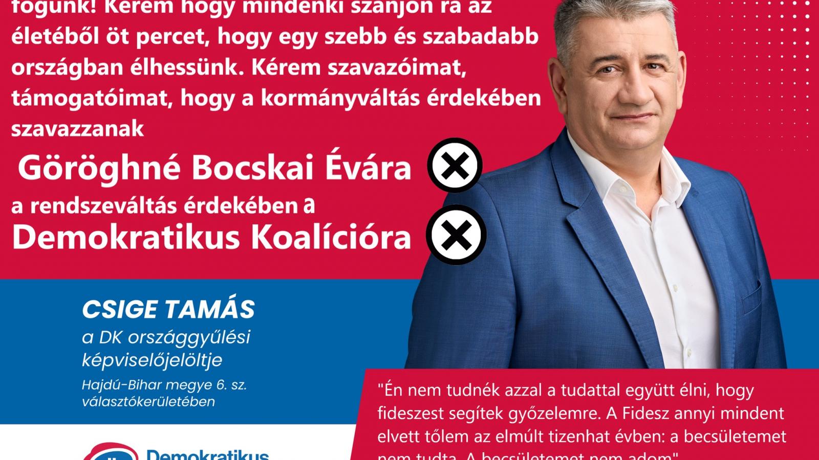 Bejegyzéséhez – melyet elsőként a Telex vett észre – Csige Tamás egy képet is mellékelt, melyről kiderül: szavazóit arra buzdítja, hogy a kormányváltás érdekében szavazzanak Göröghné Bocskai Évára, a Tisza Párt jelöltjére egyéniben, a rendszerváltás érdekében pedig a Demokratikus Koalícióra.