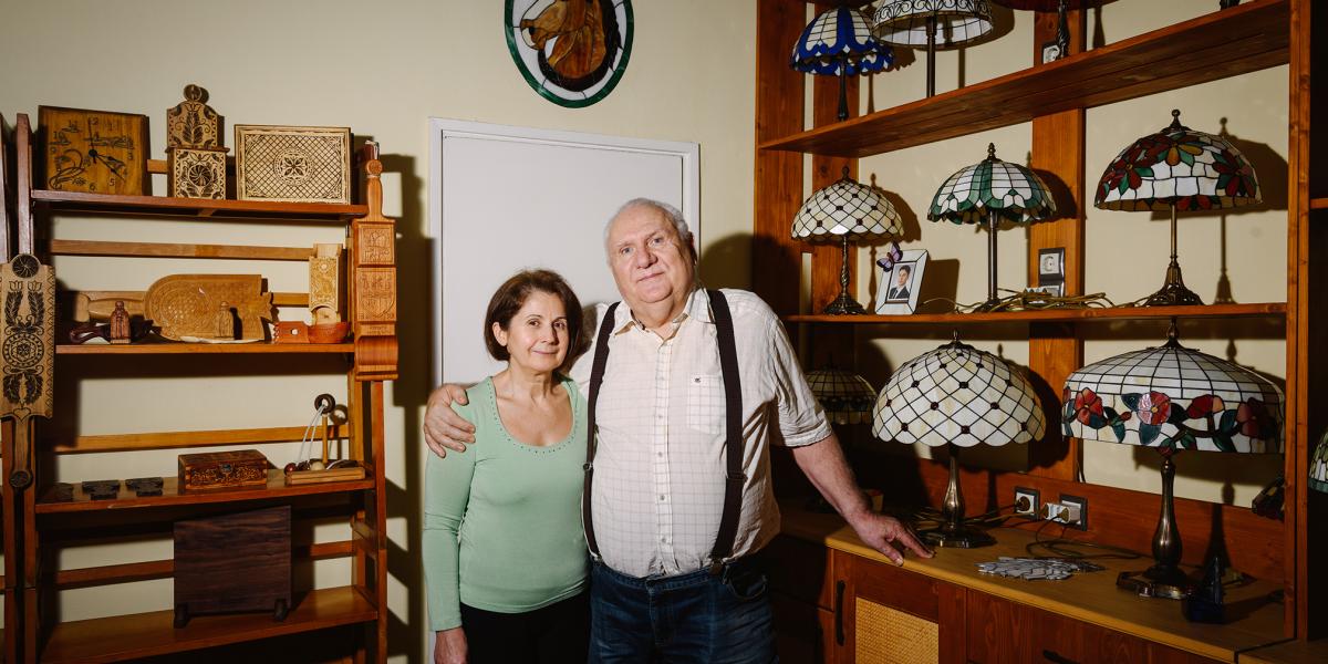 Székelyföldön, Gyergyócsomafalván a fa nem pusztán nyersanyag, hanem a mindennapok szerves része: erdő, szerszámnyél, játék és használati tárgy egyaránt. Ambrus Aladár számára a fafaragás is ilyen természetességgel volt jelen az életében. Nem volt pillanat, amikor eldöntötte volna, hogy faragó lesz – egyszerűen ebbe nőtt bele. Feleségével, Ambrusné Dakó Katalin Tiffany-lámpa-készítővel közös műhelyükben jártunk, ahol a fa és az üveg különös harmóniában találkozik.