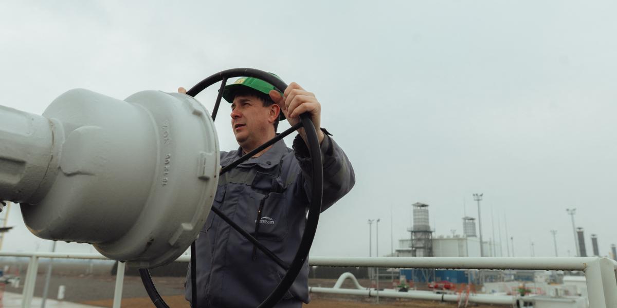 Egy munkás napi feladatokat végez egy gázlétesítményben 2025. február 28-án, a szlovákiai Velké Kapušánban.