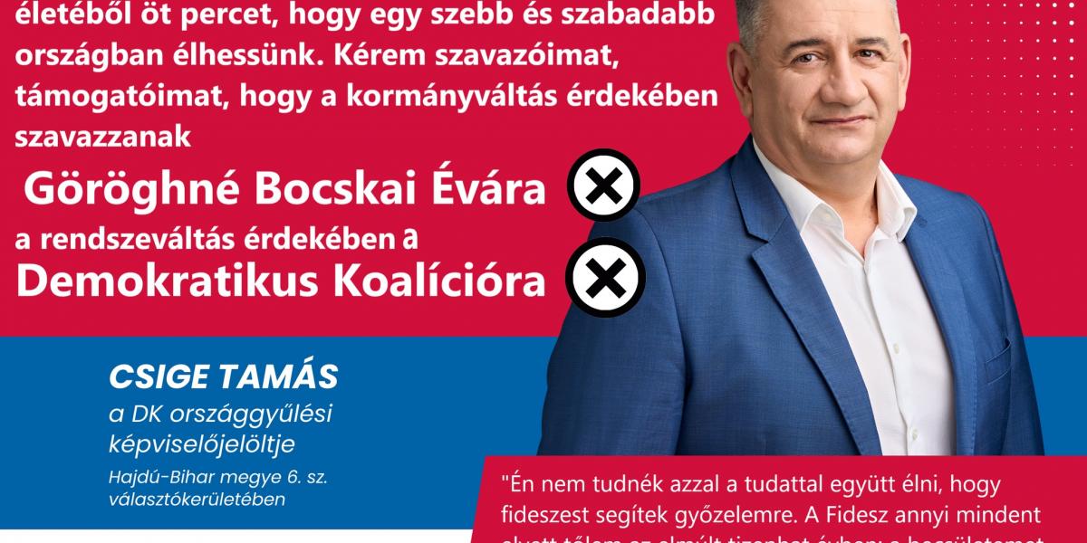A DK hajdú-bihari választókerületi jelöltje arra kéri szavazóit, hogy egyéniben a tiszás jelöltet támogassák