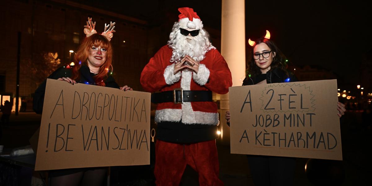 A józan drogpolitikáért tüntettek és táncoltak Mikulás napján a Kossuth téren.