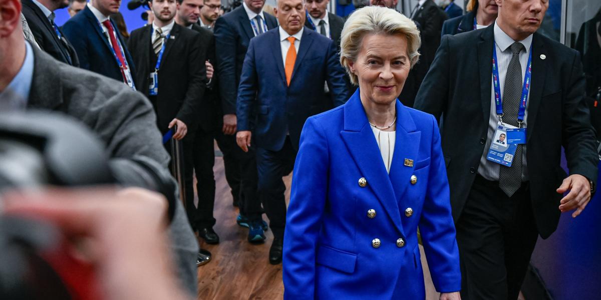 Ursula von der Leyen és Orbán Viktor az Európai Politikai Közösség csúcstalálkozójára érkezve Budapestre, 2024. november 7-én.
