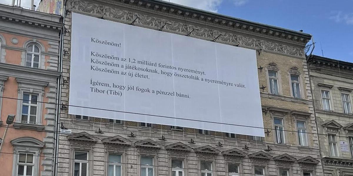 Egy Oktogonon kifeszített épülethálón köszönte meg valaki, hogy nyert 1,2 milliárd forintot