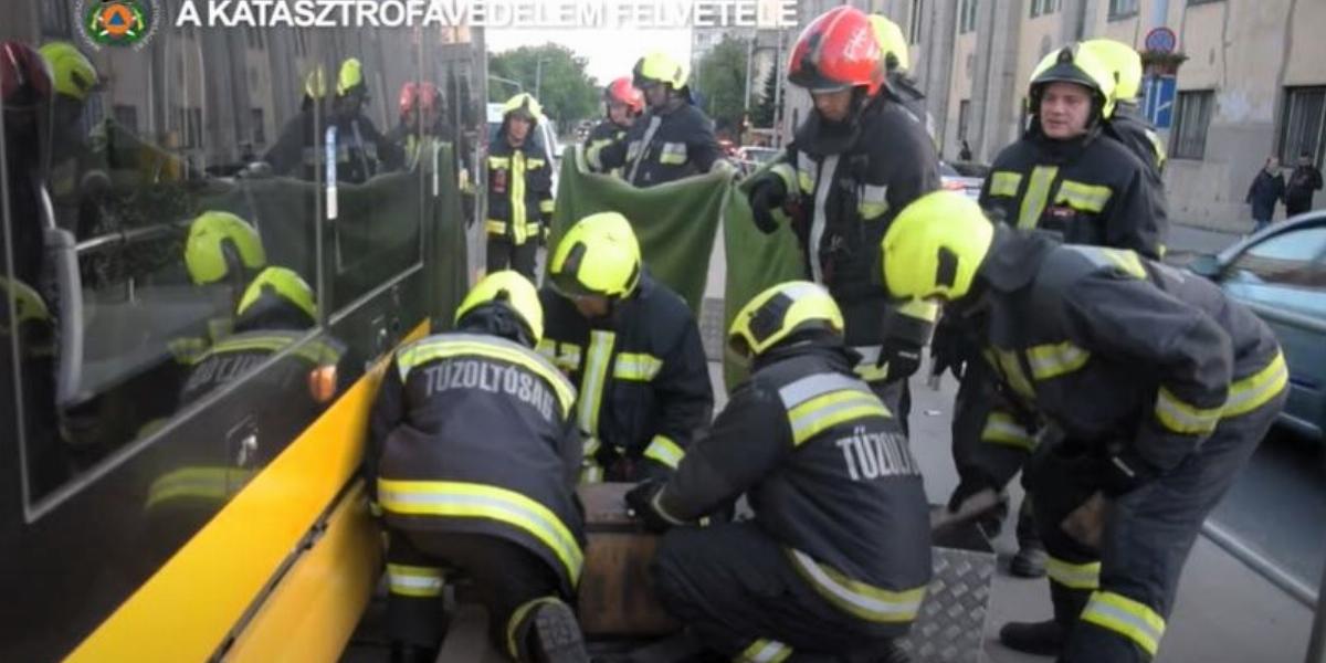 Videón, ahogy a gázolás után a tűzoltók kiemelnek egy embert a villamos alól Kőbányán