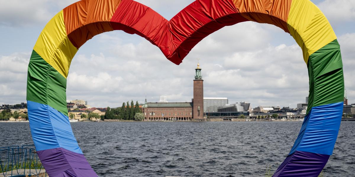 Illusztráció: A stockholmi városháza egy szivárványos szív mögött a 2024-es Stockholm Pride idején