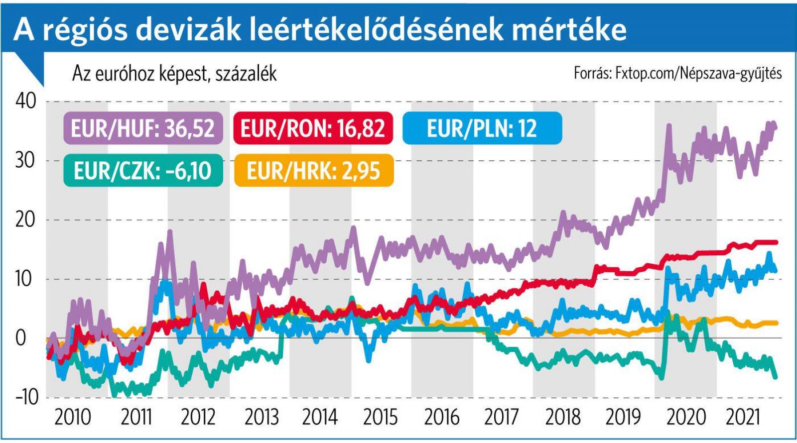 Az óév utolsó napjaiban az euróval 269 forint közelében kereskedtek – ez alig három forinttal marad el a történelmi mélyponttól. A banki elemzők többsége szerint a forintgyengülés vélhetően elérte a több évtizedes mélypontját, és bár még jöhetnek az euró jegyzésben 370 forintnál is magasabb árfolyamok, 2022-ben az MNB kamatemelései miatt előbb, vagy utóbb normalizálódhat a forint árfolyama. Nem kunszt a jelenlegi árfolyamról erősödni, ugyanis az elmúlt bő egy évtizedben a régió devizái közül a forint vesztett messze a legtöbbet az értékéből az euróval szemben. 2010 elején a második Orbán-kormány megalakulásakor egy eurót még száz forinttal olcsóbban, kevesebb mint 269 forintért lehetett megvásárolni, míg 2021 végén már 369 forinton állt az árfolyam, ami azt jelenti 12 év alatt 37 százalékot veszett értékéből magyar fizetőeszköz. Ez messze a legnagyobb értékvesztés, amit régiós valuta elszenvedett az elmúlt években.