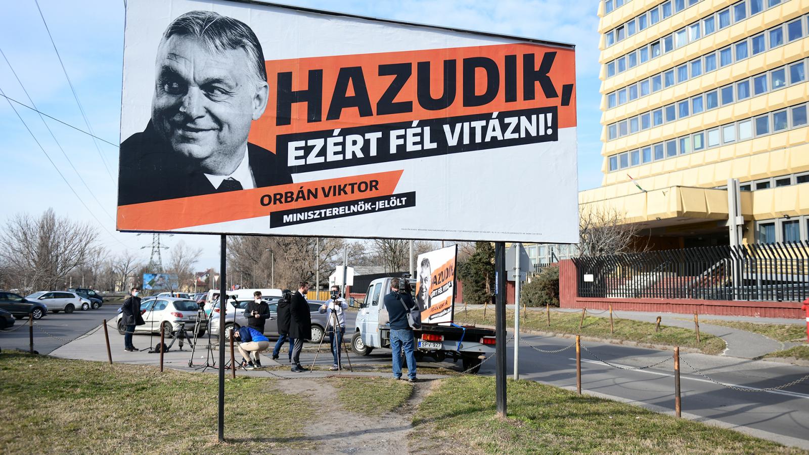A plakáton Orbán Viktor miniszterelnök látható, mellette az alábbi felirattal: „Hazudik, ezért fél vitázni!”.
