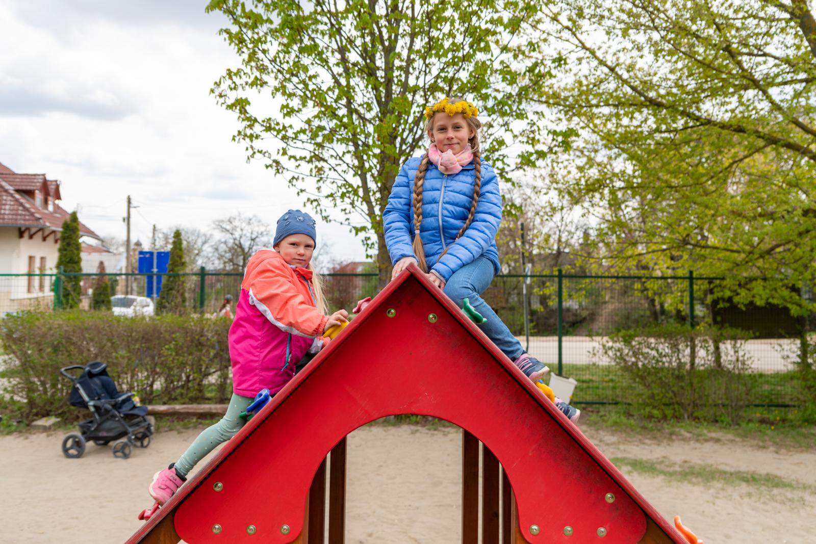 Közben a lányok pitypangból koszorút fontak, körbeszaladtak minket, és többször visszatértek a biztos ponthoz, hogy utána elengedjék azt, és egyedül fedezzék fel a világot. Ritkán voltak egyszerre egy kupacban – apukájuknak se lehet könnyű a fotózás –, aztán egy közös kép erejéig sikerült őket összeterelni, és már profi modellként mosolyogtak, mikor édesanyjuk kimondta a varázsszót: „vízibicikli!”